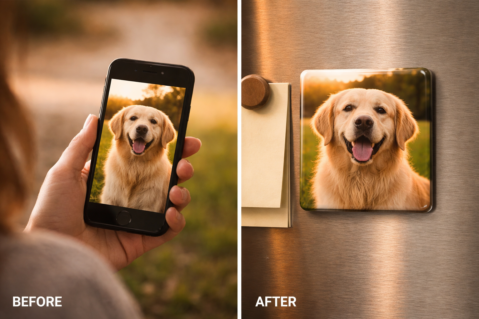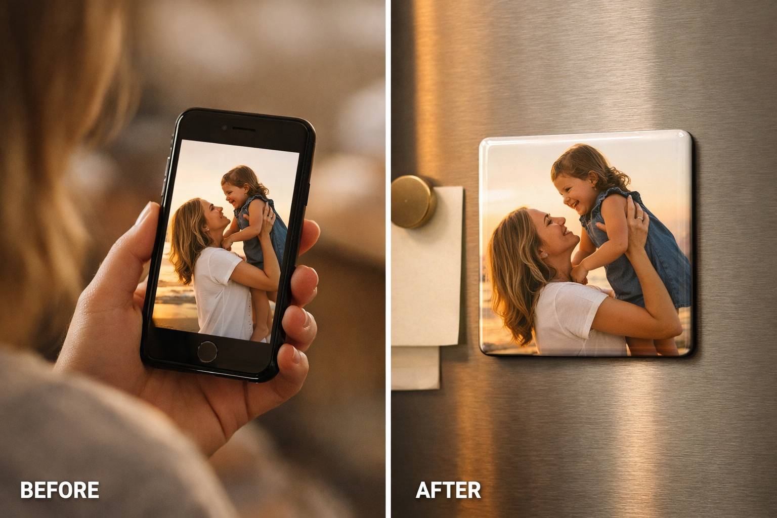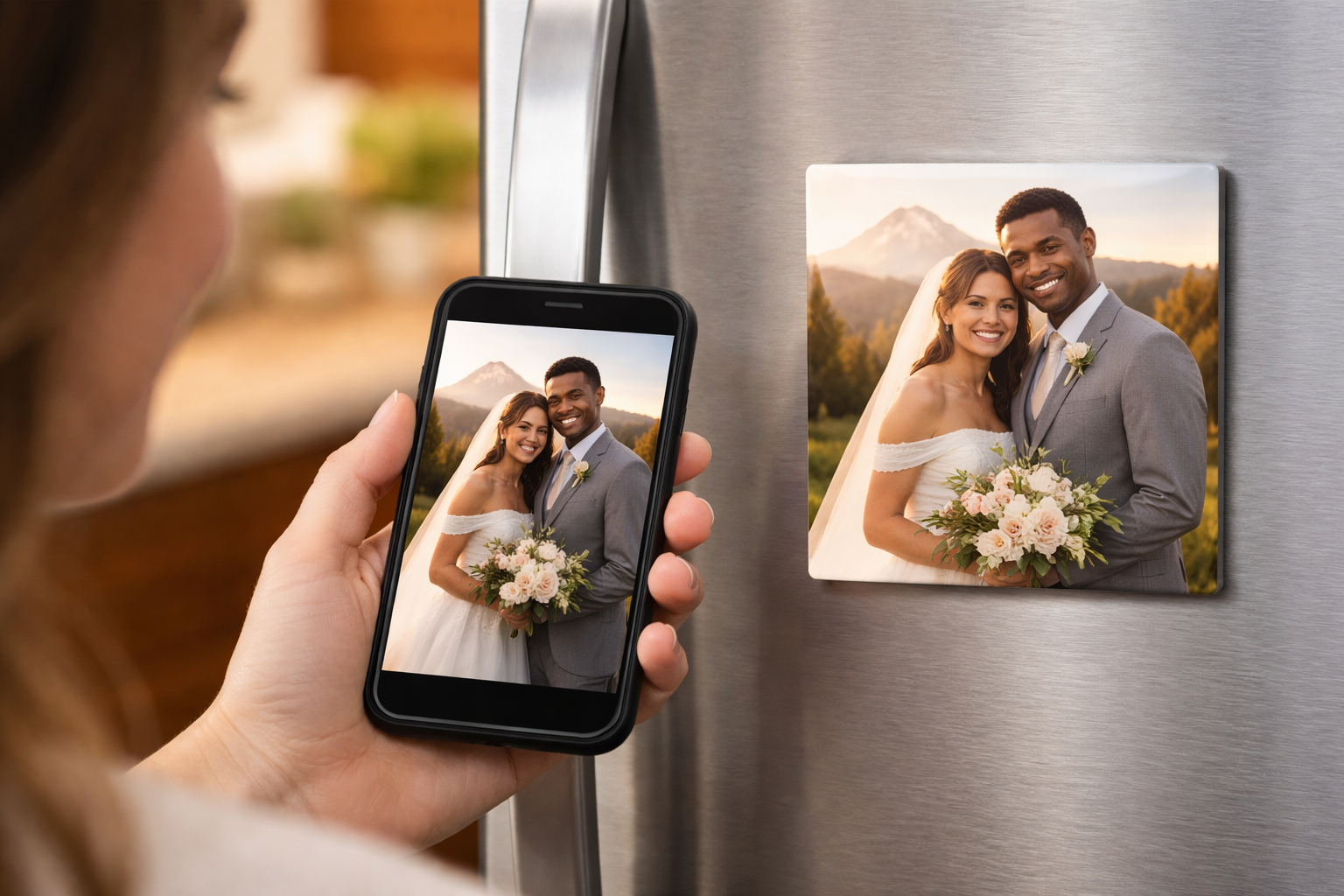 No corporate warehouse. No algorithm deciding what matters. Just Dave and Tiffany, printing photos you love onto magnets you'll actually keep.